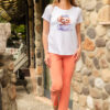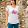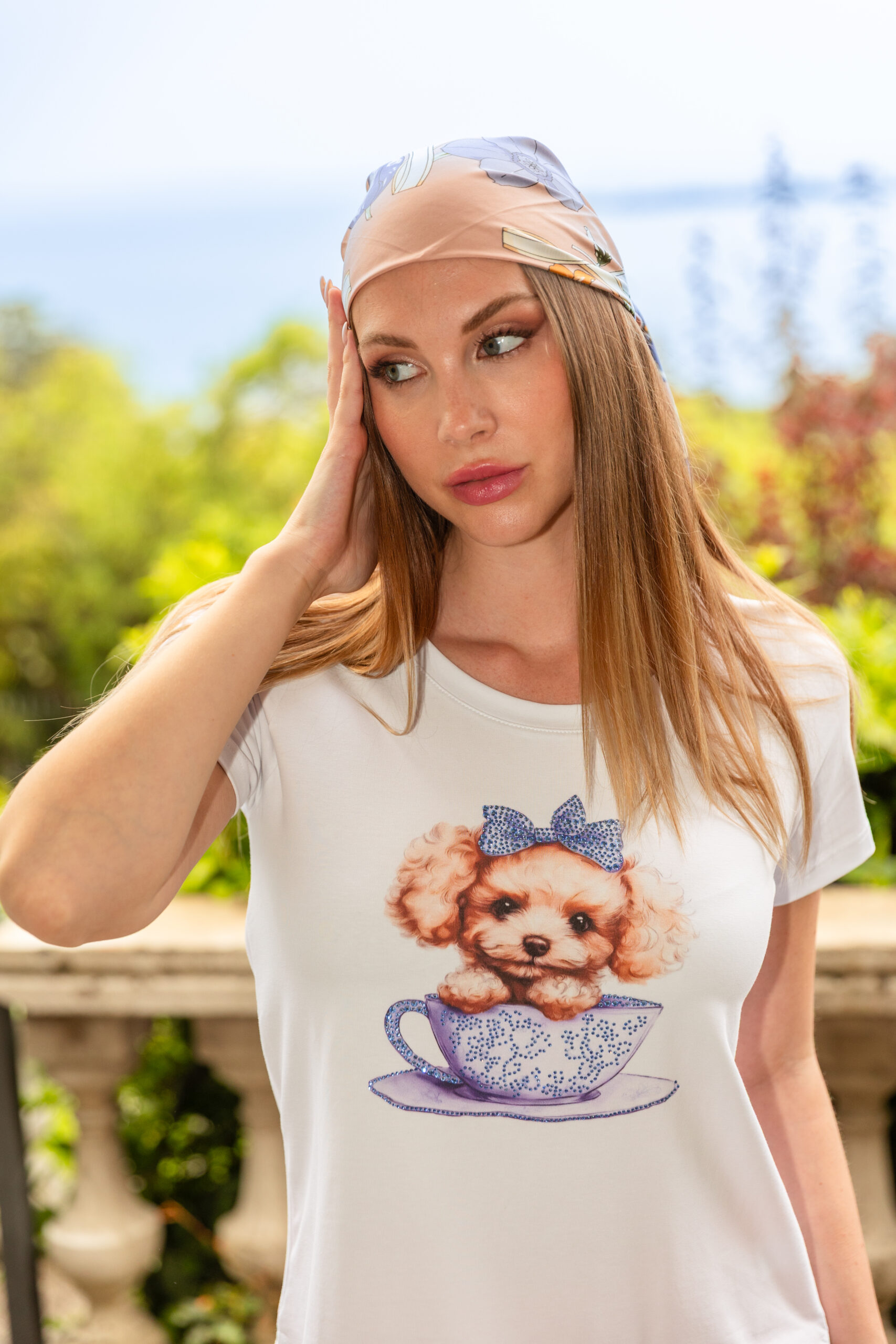 T-shirt in fresco cotone con scollo tondo e mezze maniche con divertente stampa estiva frontale decorata con strass. Vestibilità comfort.